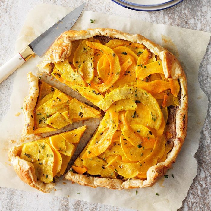 This recipe is hiding a big surprise. Flaky, rustic-looking pastry shells hold a sweet and spicy pecan layer under the squash slices. —Ann Marie Moch, Kintyre, ND