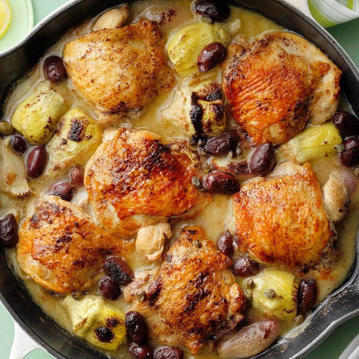 This chicken and artichoke dish was inspired by a-once-in-a-lifetime trip to Santorini for my parents’ 40th anniversary. It’s cooked in a big skillet until the chicken basically falls of the bone and all the flavors meld together into a sauce that will literally have you spooning into your mouth. It’s really a showstopper! —Grace Vallo, Salem, New Hampshire