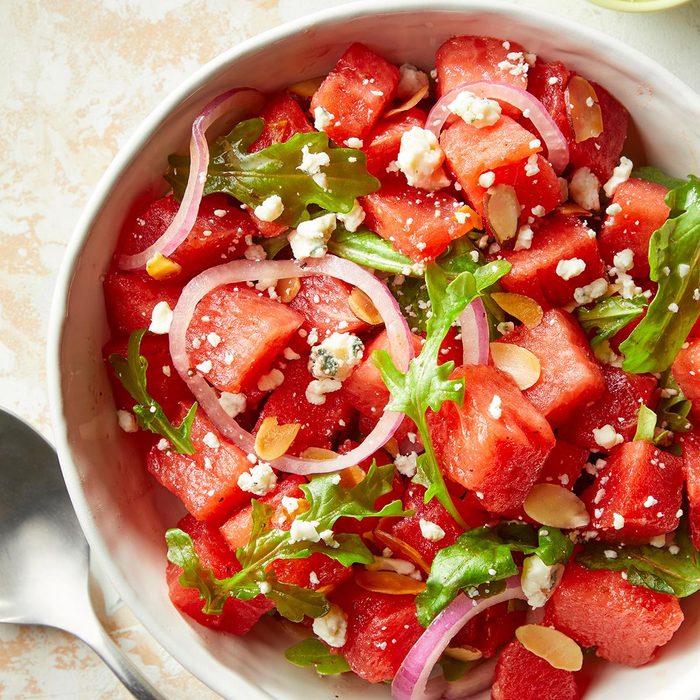 Watermelon and tomatoes may seem an unlikely pair, but they team up to make a winning combination in this eye-catching salad. —Matthew Denton, Seattle, Washington