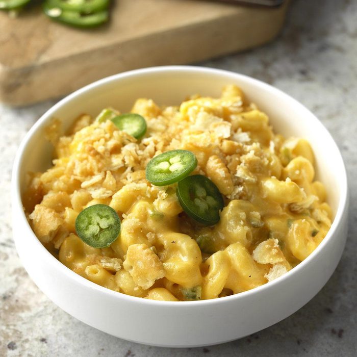 Many years ago after I had had knee surgery, a friend brought me a big casserole of mac and cheese along with the recipe. I have fiddled with the recipe over the years, most recently adding jalapenos at the request of my son. What an awesome spicy twist! —Teresa Gustafson, Elkton, Maryland