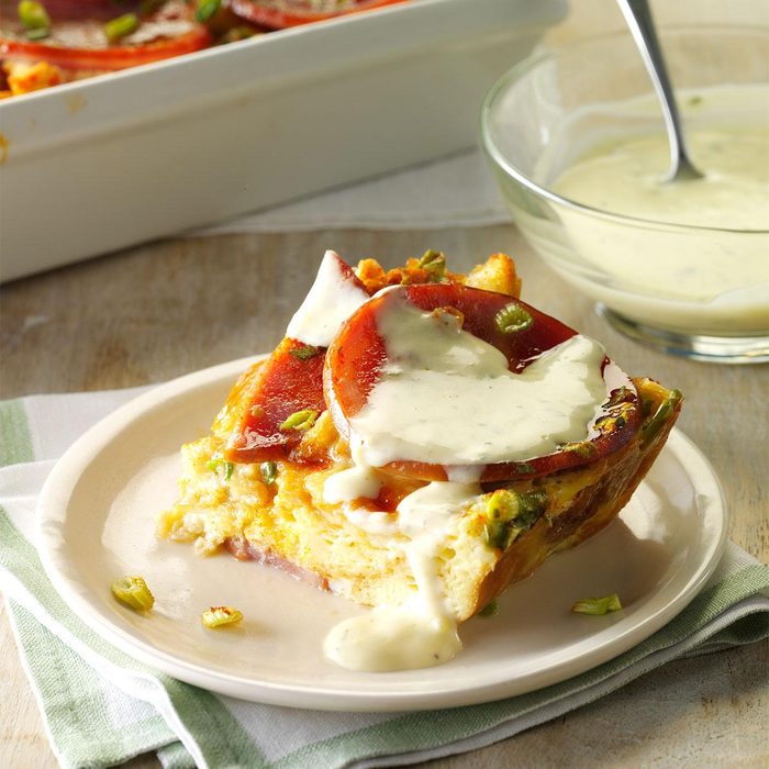 My best friend and son's godfather introduced me to this recipe. It is a perfect holiday or Sunday brunch menu addition. It is easy to make and has a rich taste, so you can’t help but feel a little fancy while eating it. We recently enjoyed this at a special family occasion, and now it is a favorite. I like to bake it, but it can also be made in a stovetop skillet. —Amanda Wilson, Milwaukee, Wisconsin