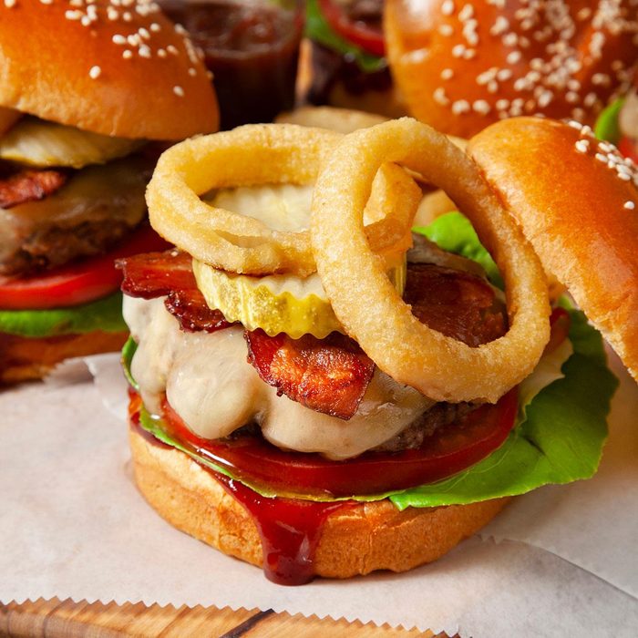 Every family has a burger of choice, and this is ours. It's stacked tall with bacon and crunchy onion rings. —Paula Homer, Nampa, Idaho