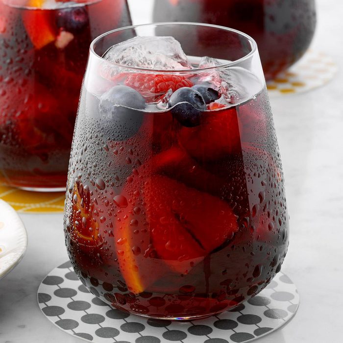 Sangria is a Spanish drink of wine mixed with spices, cut fruit, and fruit juice, sherry or brandy. It’s best to mix this and let it sit for an hour or more before serving so all the flavors of the fruit and wine blend together. —Taste of Home Test Kitchen
