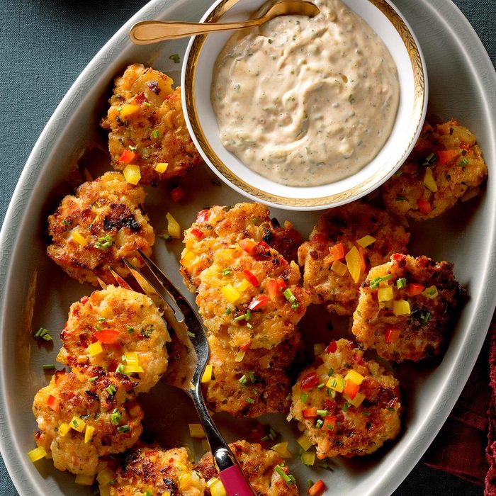 1 seafood cake with about 1/2 teaspoon sauce (calculated without garnishes): 88 calories, 7g fat (3g saturated fat), 21mg cholesterol, 86mg sodium, 2g carbohydrate (1g sugars, 0 fiber), 3g protein.