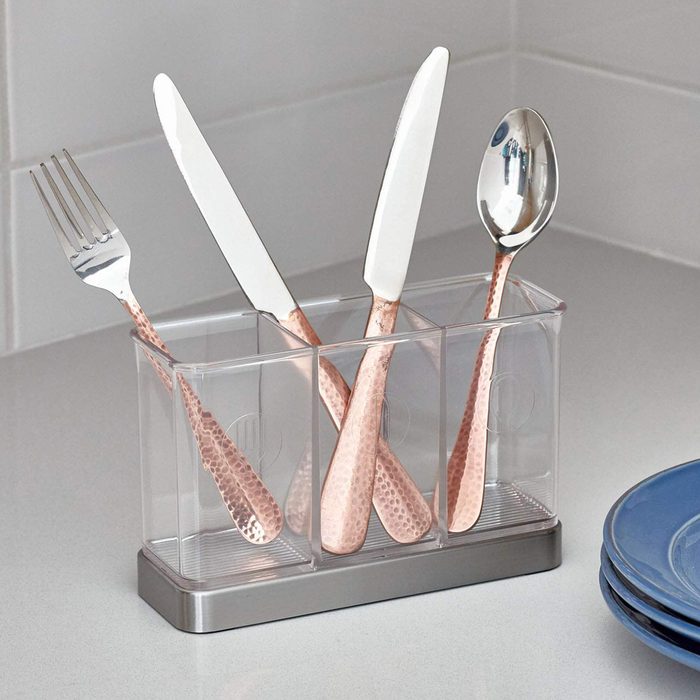 Do you have an extra-deep pocket drawer—or extra counter space? Then vertical is best! Store your forks and spoons standing up in a flatware organizer ($10) for easy access. (You’ll be able to use this to hold utensils for guests at your next potluck, too.)