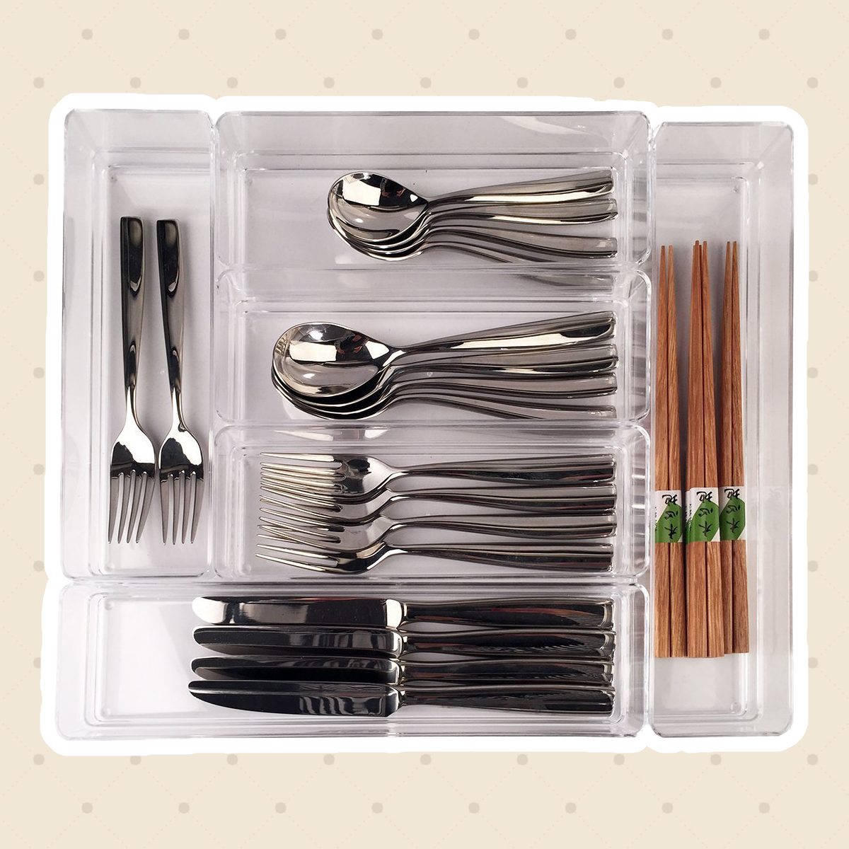 I have a designated drawer at home where my silverware and cooking utensils live together—organized sometimes, but not always! I use a bamboo organizer ($22) to best share the space.