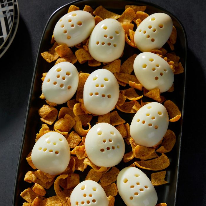 Thrill partygoers with Halloween deviled eggs. The mayonnaise-filled bites are one of my favorite apps, so I had fun creating a spooky version. —Nick Iverson, Milwaukee, Wisconsin