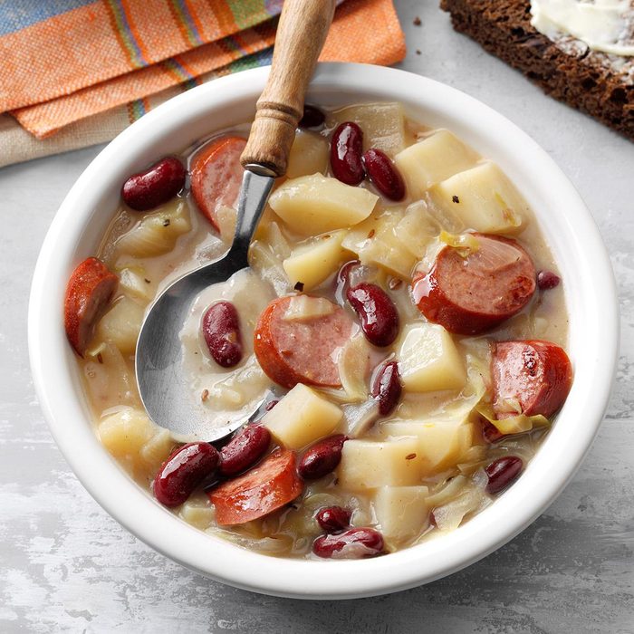 Kielbasa is a smoked Polish sausage made with garlic and spices, and it’s the base of this hearty and warming stew. Two cups of shredded cabbage might look like a lot when you’re putting it into the pot, but it will cook down to a manageable amount by the time the potatoes are cooked through.