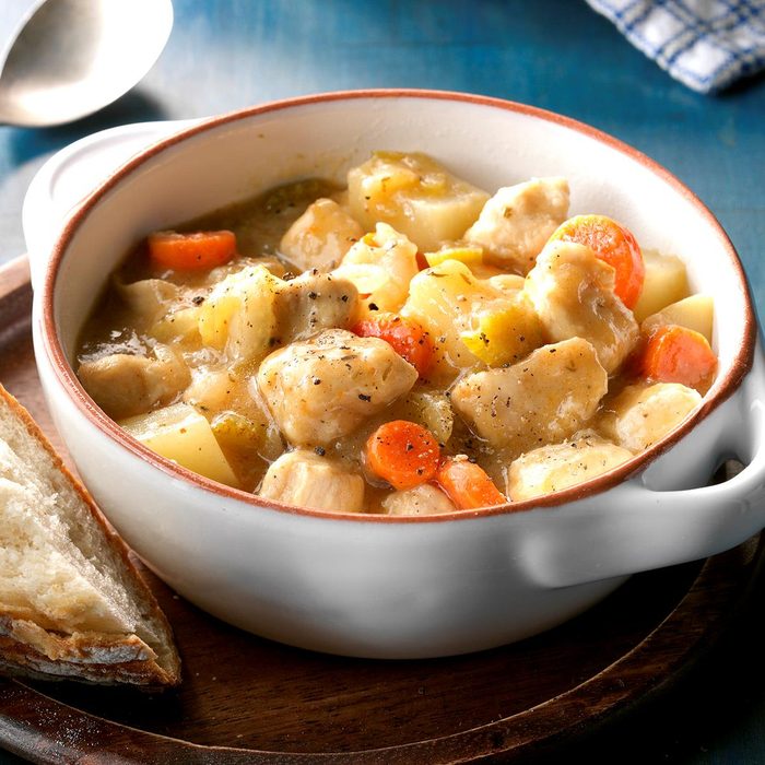 This stew gets its incredible flavor from chicken thighs cooked in Italian dressing and white wine. You can use chicken breasts if you prefer, but the thighs add a richer flavor. To make the dish feel even more comforting, serve the stew over mashed potatoes.
