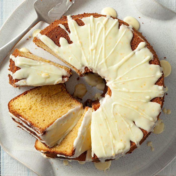 The delicate orange flavor of this simply delicious cake is perfect for rounding out a rich meal. The orange glaze would also be a nice way to top off slices of your favorite angel food cake. —Marjorie Ebert, Conewango Valley, New York