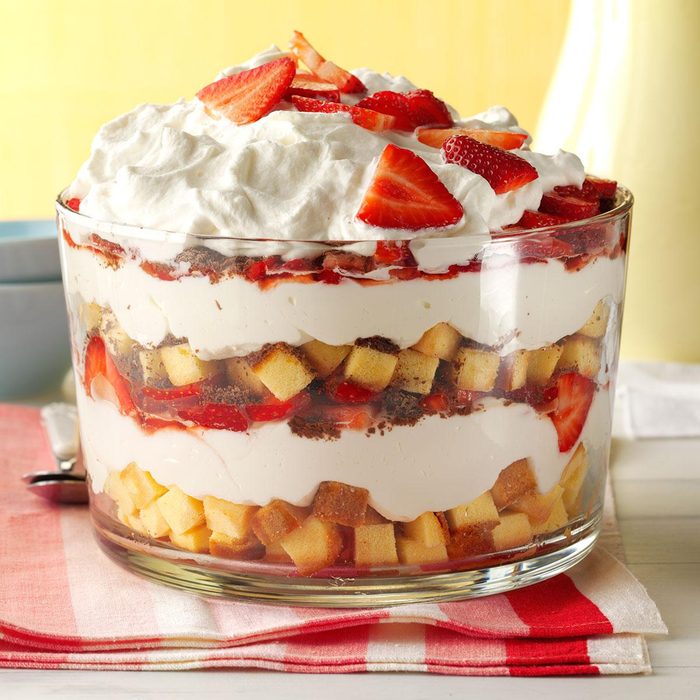 For a dessert that looks as great as it tastes, trifles can’t be beat (Psst! Curious on what is a trifle? Check out this guide!). Layers of rich pound cake, luscious cream and sweet strawberries make this treat very inviting. —Marnie Stoughton, Glenburnie, Ontario