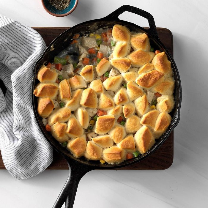 A golden crust made with the best refrigerated biscuit dough tops this comforting, creamy mixture. You can get a head start by baking the biscuits separately while you prep the rest of the dish.