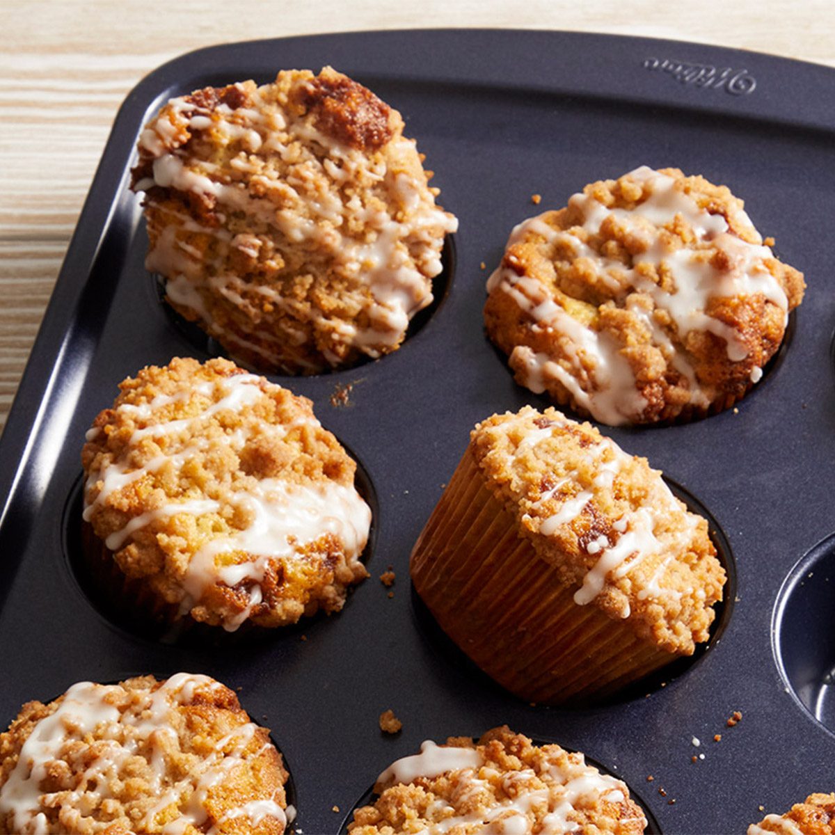 These easy coffee cake muffins bake up with high domes topped with streusel and a fragrant vanilla glaze.
