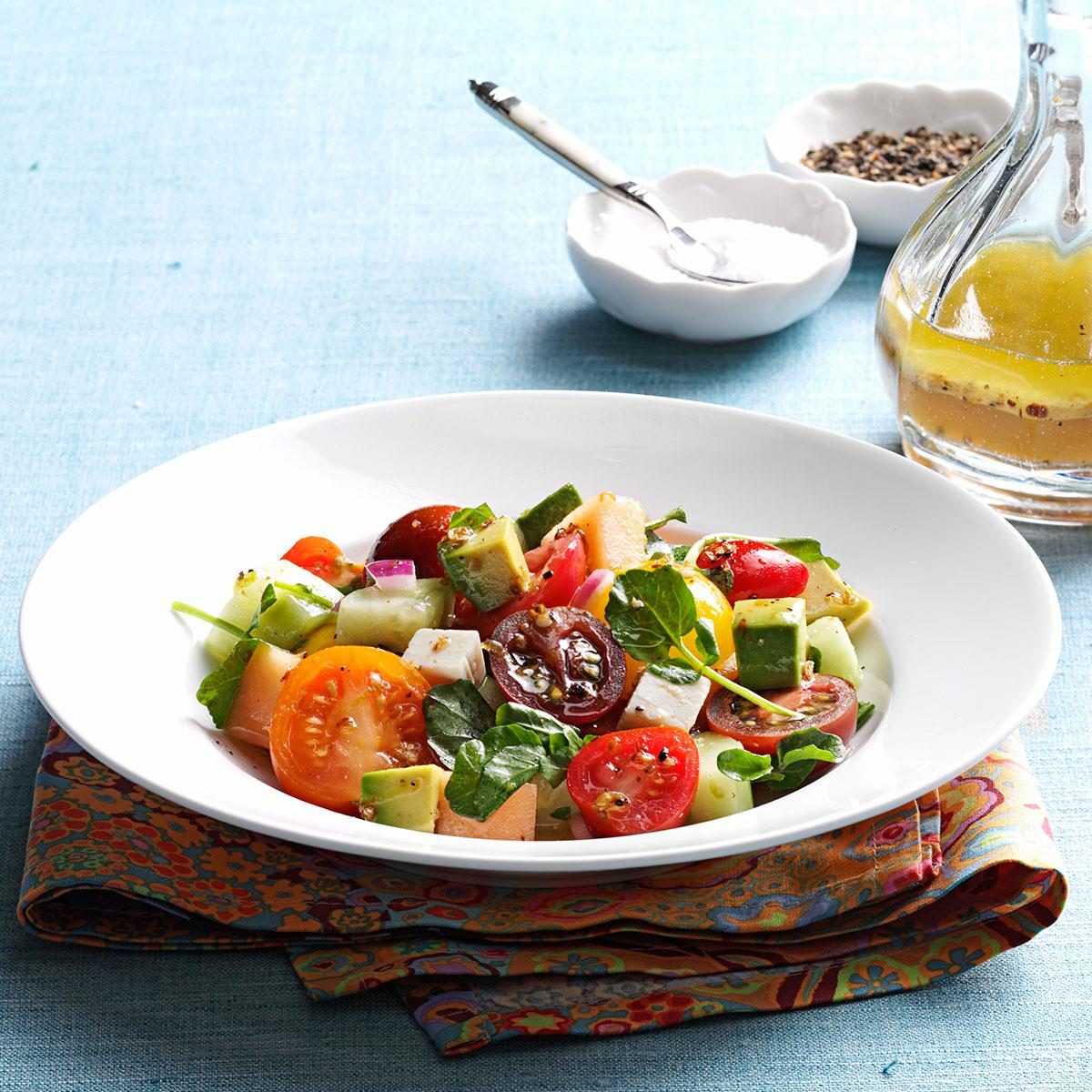 Looking for a savory summer salad? The combination of tomatoes, cantaloupe, avocado and greens sings with freshness and health.—Carolyn Kumpe,...