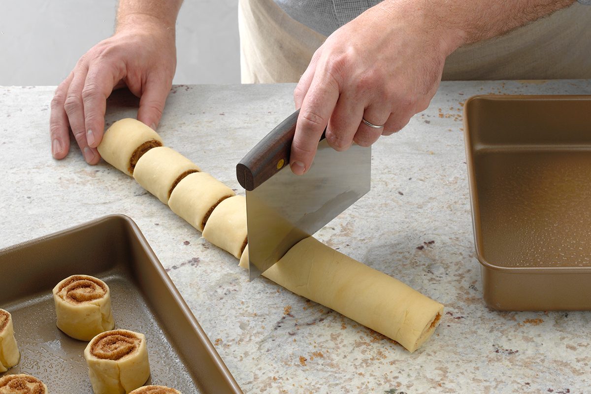 Next, use a bench scraper or a sharp knife to slice off the ends of each roll (you can bake these scraps as an extra treat). Then cut each roll into eight even pieces.