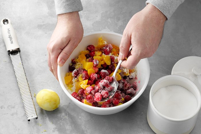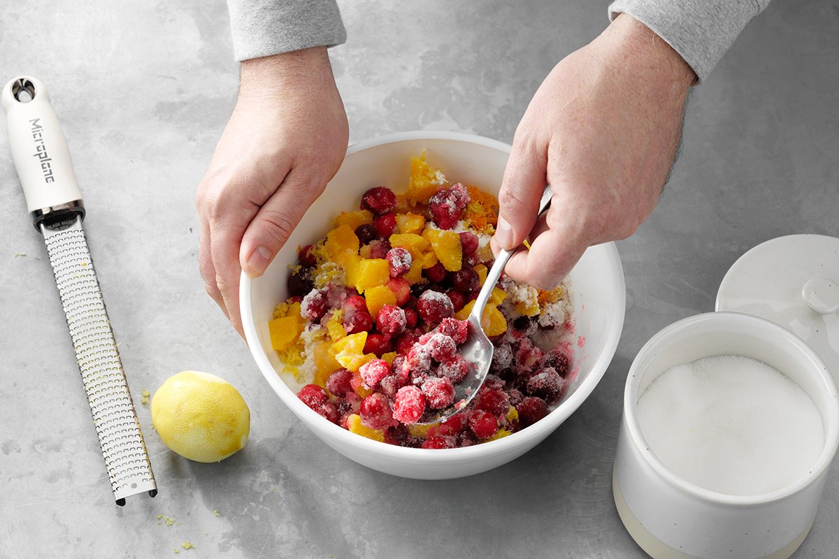 Preheat the oven to 450°F. Toss together all the filling ingredients—cranberries, orange zest, lemon zest, sugar, orange segments, flour, butter and salt—in a large mixing bowl.