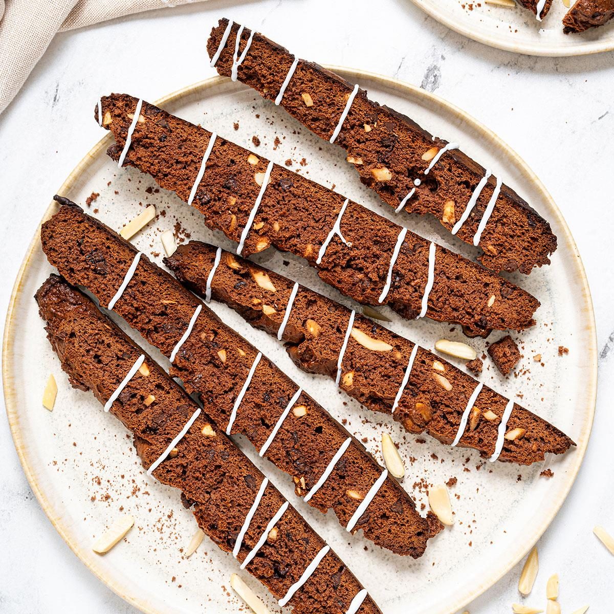Easy chocolate biscotti comes together quickly thanks to boxed cake mix and chocolate syrup, and a drizzle of white chocolate...