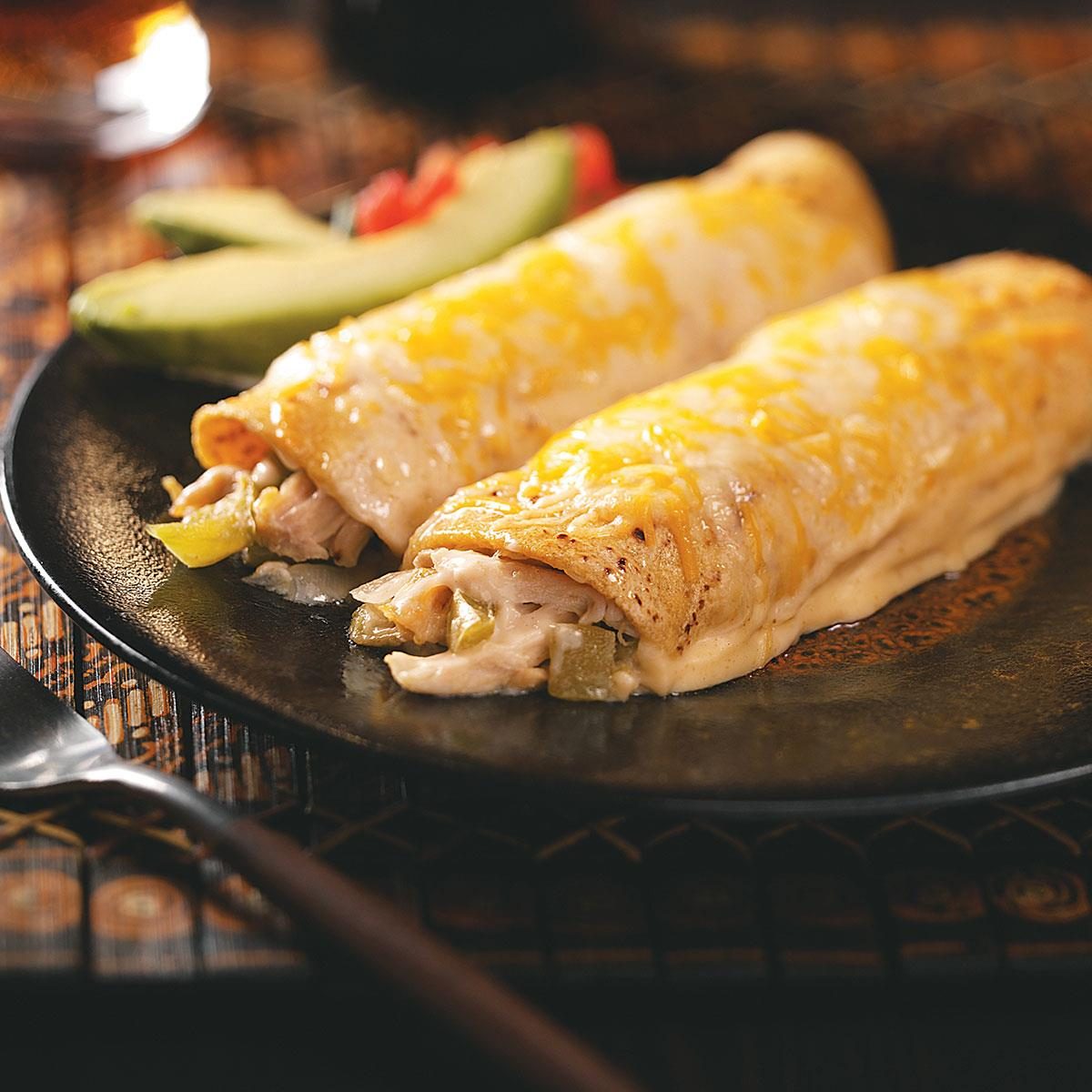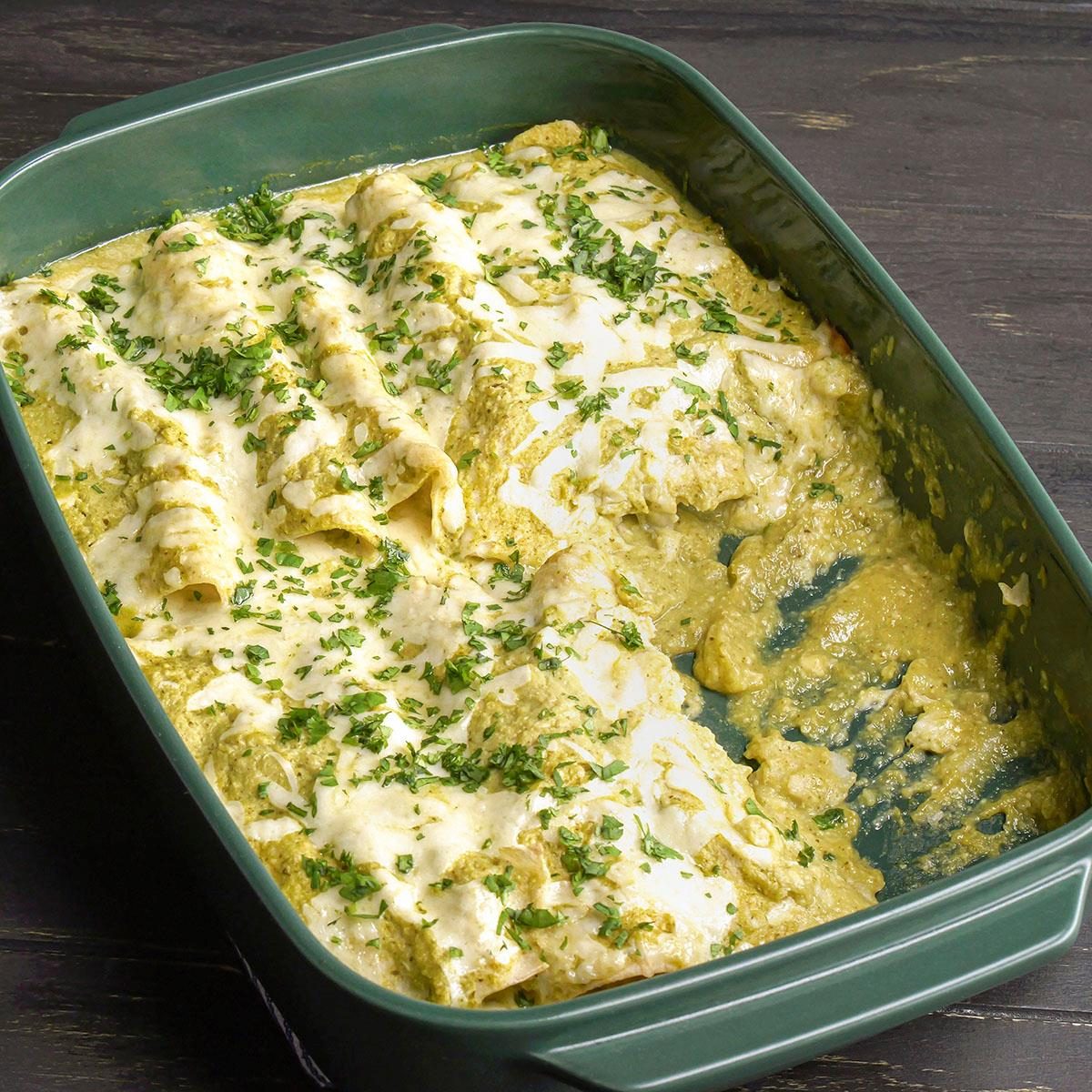 These enchiladas have a bit of a kick, thanks to chili powder and green chiles, but the deliciously creamy sauce...
