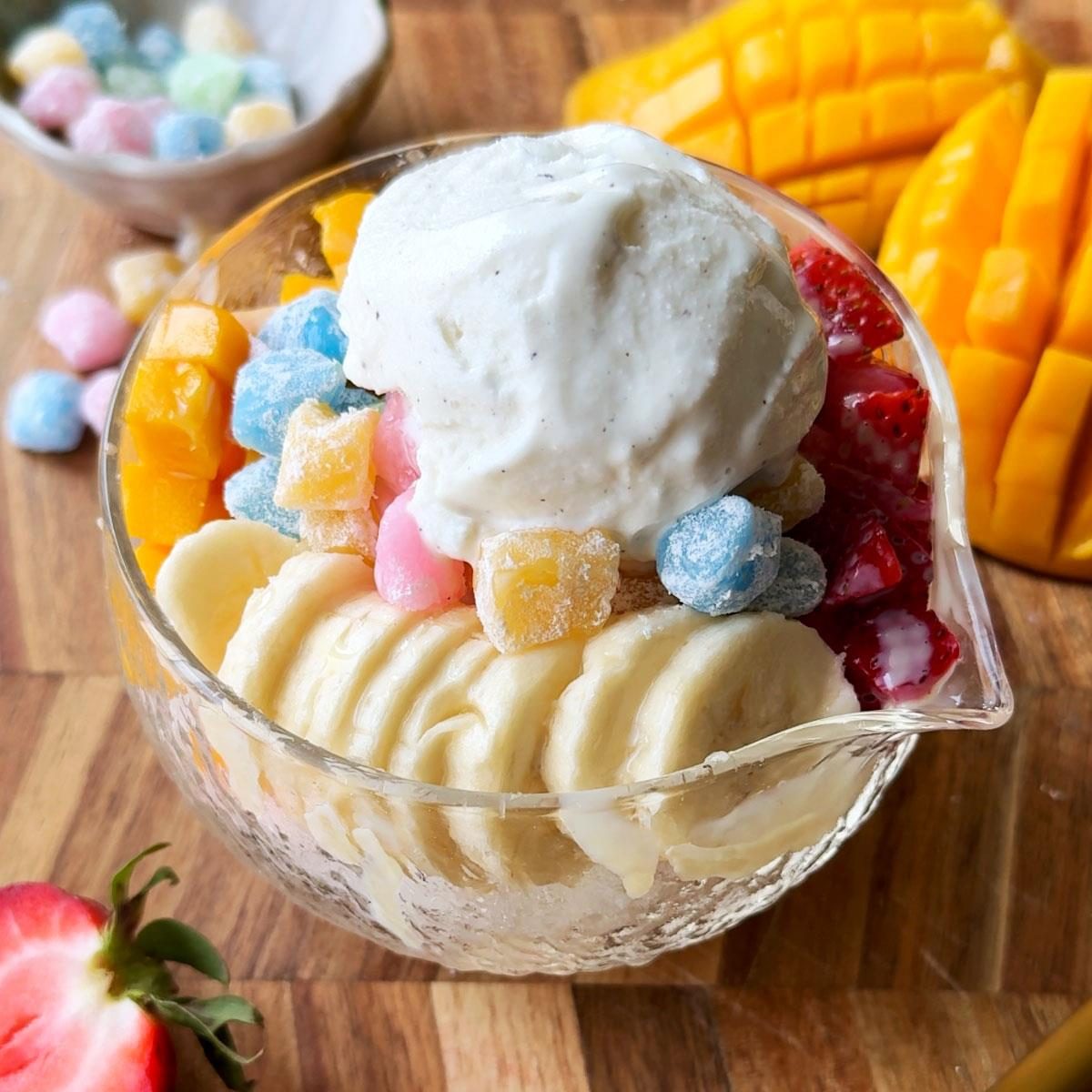 This shaved ice recipe is all about making it your own! The tiny pieces of ice melt harmoniously with fresh seasonal fruits, sweetened condensed milk and a mix of toppings. I like sprinkling on crunchy, colorful cereal and something chewy like mochi or gummy candy. —Lucy Wang, Los Angeles, California