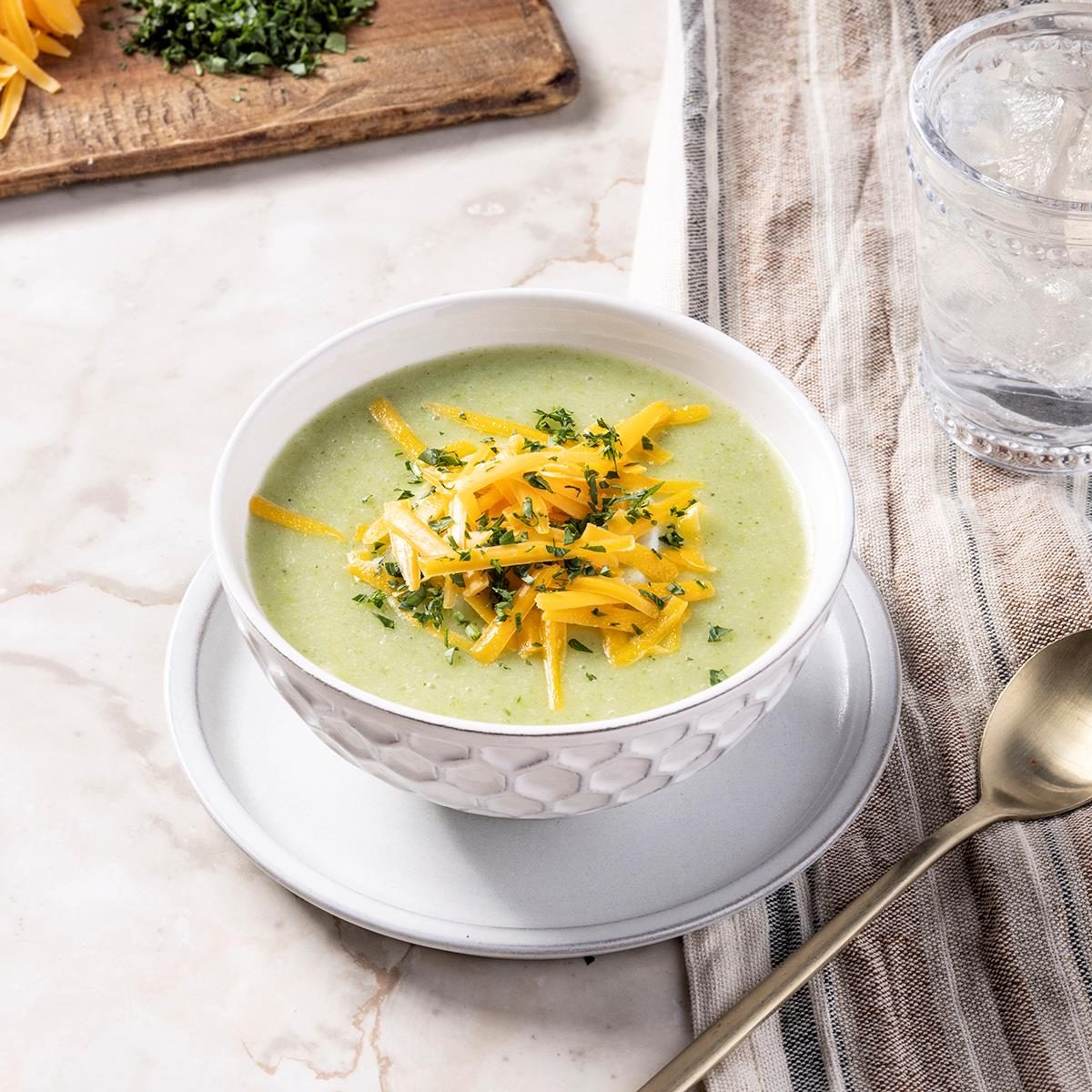 You can't go wrong with cream of broccoli soup when you need a comforting meal—especially when it's topped with cheddar...
