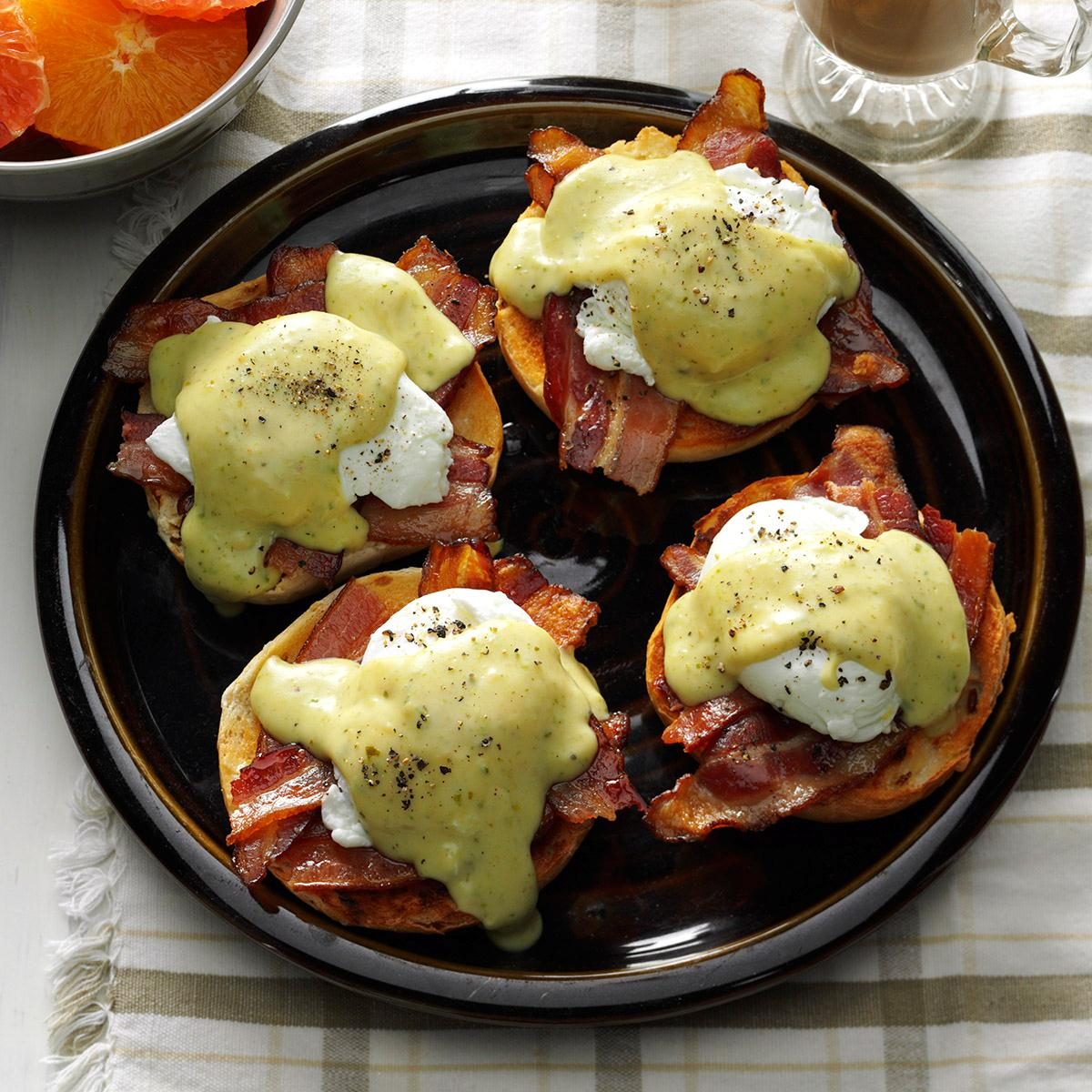 Creamy Pesto ‘n Bacon Eggs Benedict