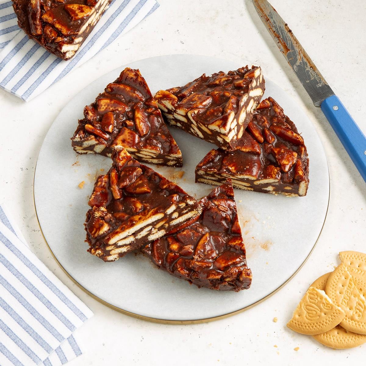 This lazy cake will fix that sweet tooth craving. The no-bake treat is made with cookie pieces stirred with hazelnut...