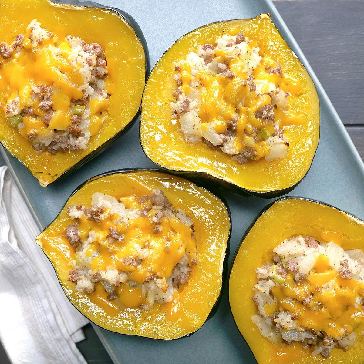 Our Test Kitchen offer up this unique way to present leftover stuffing. Serve this squash as a hearty side dish...